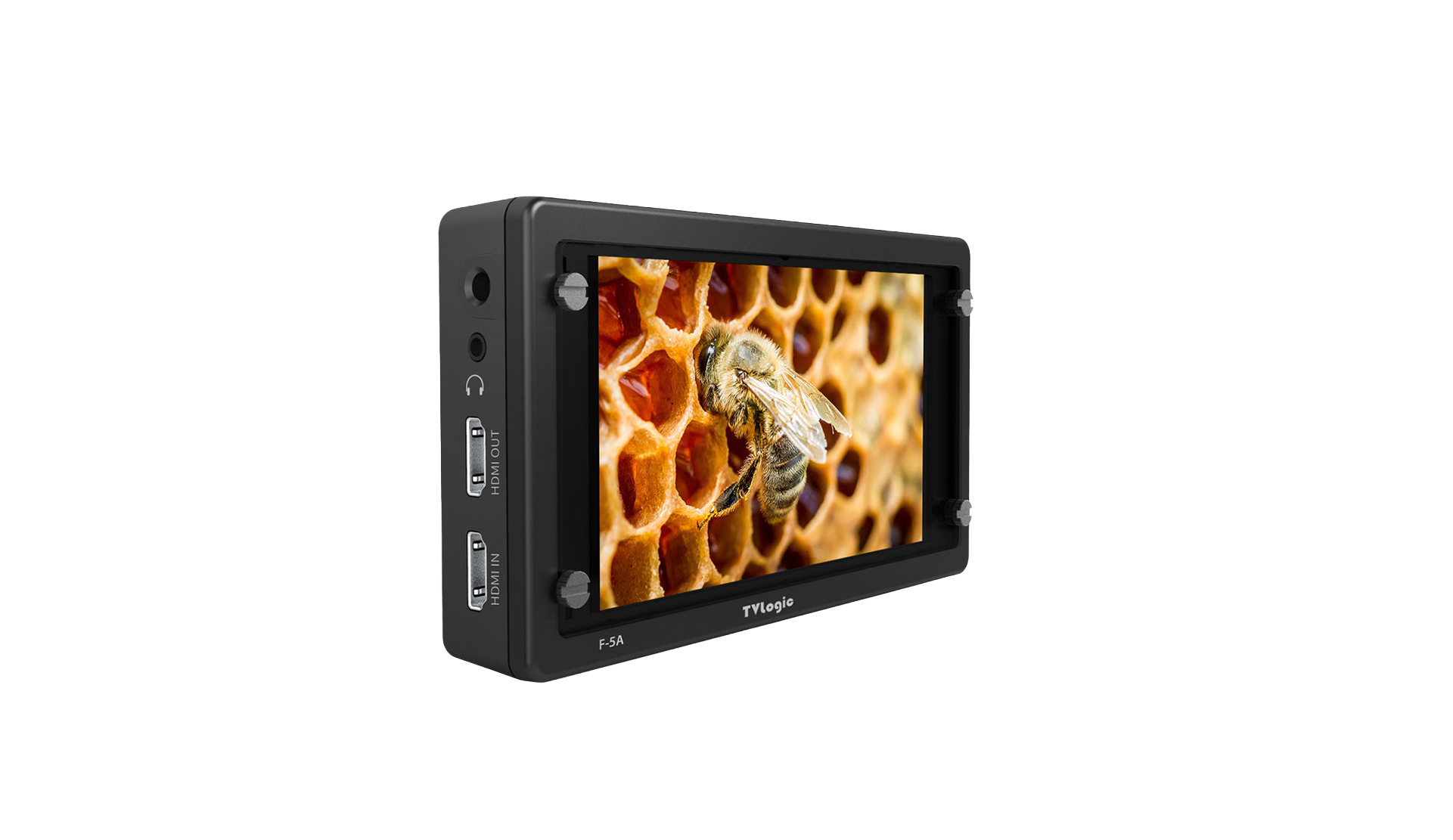 The TVLogic F-5A is a 5.5 inch 1920×1080 IPS-LCD field monitor with approximately 500 nits peak brightness and a contrast ratio of 1000:1.