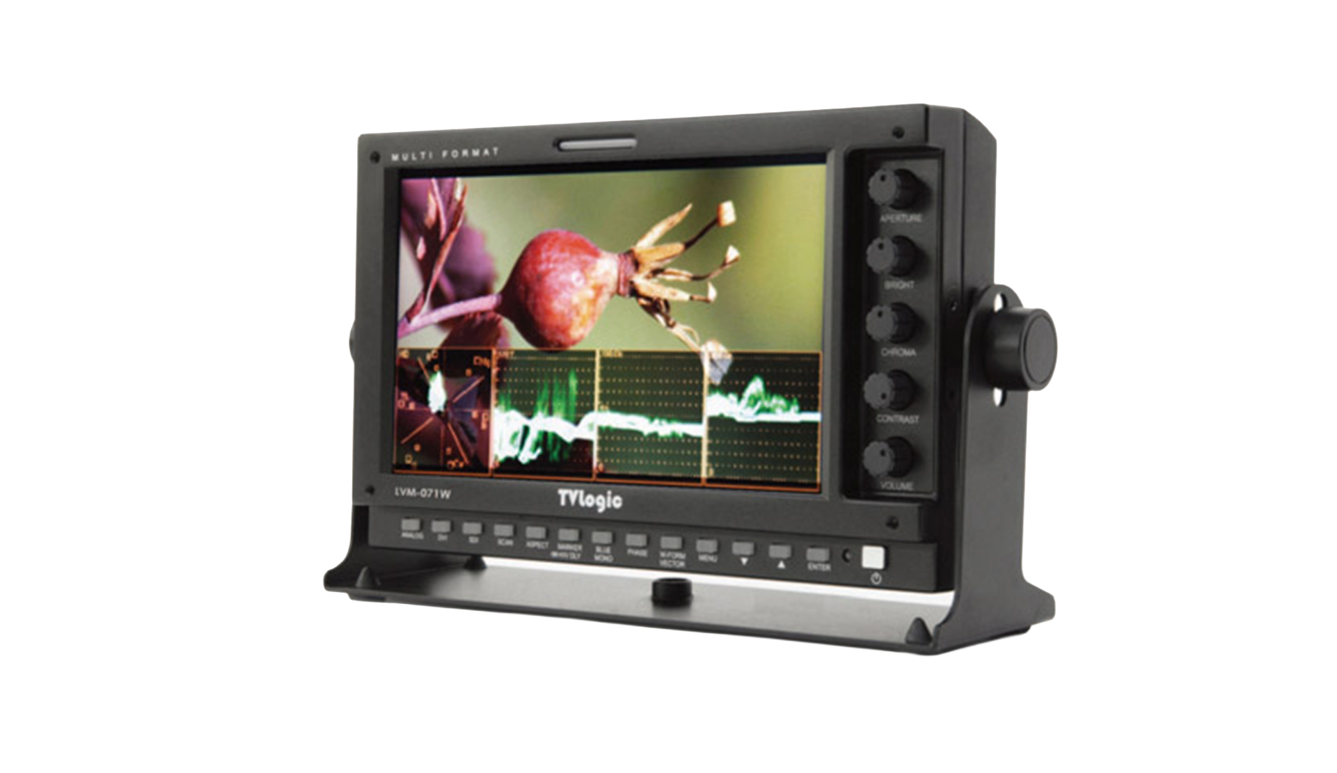 The TVLogic LVM-071W is a 7 inch 800×480 production monitor with a brightness of about 350 nits and a contrast ratio of 700:1. It supports SDI, DVI, component and composite signals with SDI loop-through, making it compatible with a wide range of broadcast and camera setups. Monitoring tools include waveform, vectorscope, focus assist and markers.